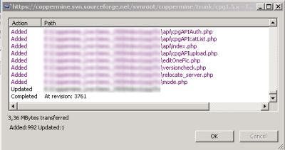 A dialog will pop up that shows the progress of the initial check out. Depending on your connection speed, this will take some time - during the initial check out, all files within the repository are being downloaded.As you can see by looking at any coppermine source code file, there is a reference to a revision number in each file (deliberately added). This is supposed to help developers mostly, as you can clearly determine wether files are up-to-date.