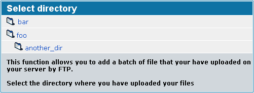 FTP-uploads plus batch-adding is the recommended method to upload files for the admin of a Coppermine-driven gallery. Only the admin can perform this for security reasons; non-admins can not perform this operation and need to use one of the other methods to upload files.