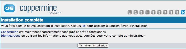 | Your MySQL configuration (votre configuration MySQL) | MySQL est le type de service de base de données disponible sur la plupart des serveurs web. Si vous ne l'avez pas, vous ne pouvez pas l'installer vous-même. Si vous avez un hébergement web, vous êtes probablement malchanceux. Il est obligatoire d'avoir une base de données MySQL pour utiliser Coppermine ou beaucoup d'autres scripts PHP. Vous ne pouvez pas truquer les informations MySQL pendant l'installation, vous devez les connaître avant, et entrer les informations comme demandé. Si vous n'êtes pas sur des informations requises, demandez votre hébergeur. |