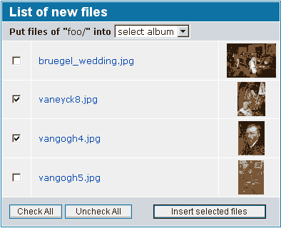 - select the photos you wish to upload (by ticking them). New pics are automatically pre-selected, those that already are in your coppermine database are not selected. Next select the album you wish to insert them into. Click "Insert Selected Pictures" to start the batch-add process.