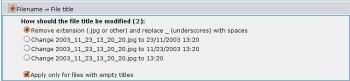 Mass-skapa filtitlar baserade på filnamn eller uppladdningsdatum. Välj först hur filnamnet ska användas som titel. Bocka för alternativet "Tillämpa endast för filer som saknar titlar" (förbockat som standard) för att säkerställa att du inte skriver över befintliga titlar. Filtitlar är viktiga för att underlätta för sökmotorer, så du bör sätta namn manuellt om du kan (använd funktionen "redigera filer" för det specifika albumet) och använd den automatiska lösningen från administratörsmenyn bara om det inte finns annat sätt att ange filtitlar till filer i ditt galleri.
